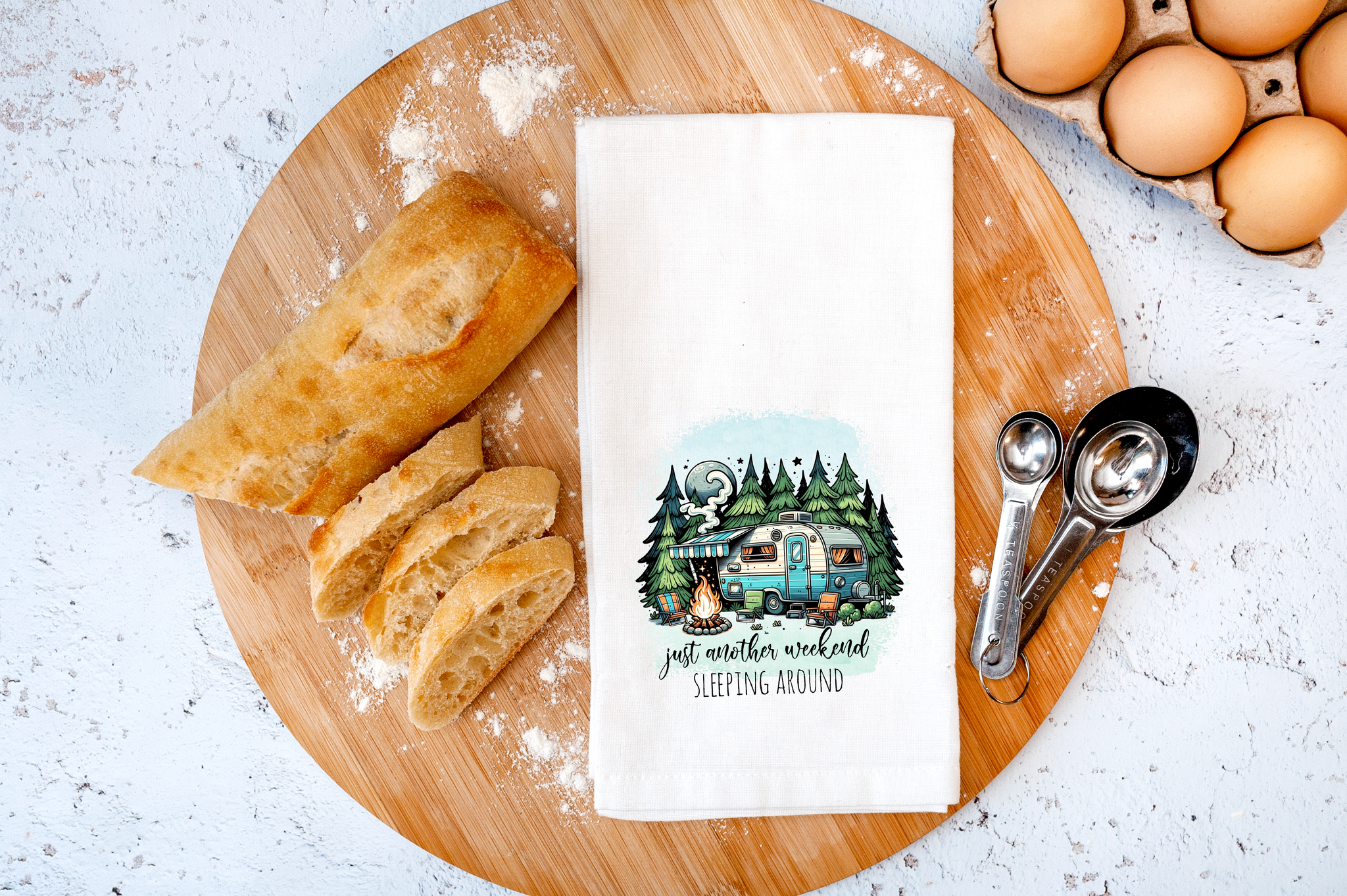 Camping Humor Flour Sack Towel – “Just Another Weekend Sleeping Around” – RV Camper Decor Tea Towel