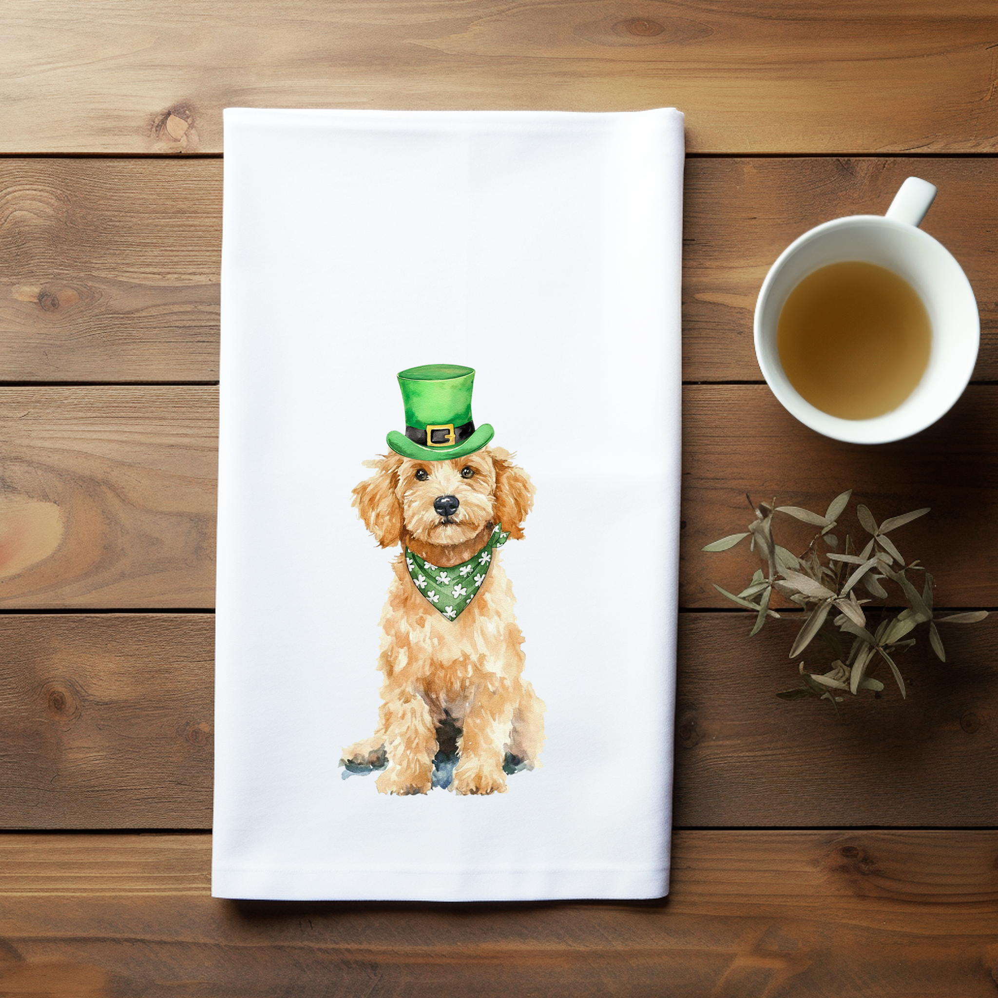 Add a little Irish charm (and a whole lot of fluff) to your kitchen with this Golden Doodle St. Patrick’s Day flour sack towel! Featuring an adorable watercolor-style doodle wearing a festive green hat and shamrock bandana, this towel is the perfect blend of cute, cozy, and just plain lucky.