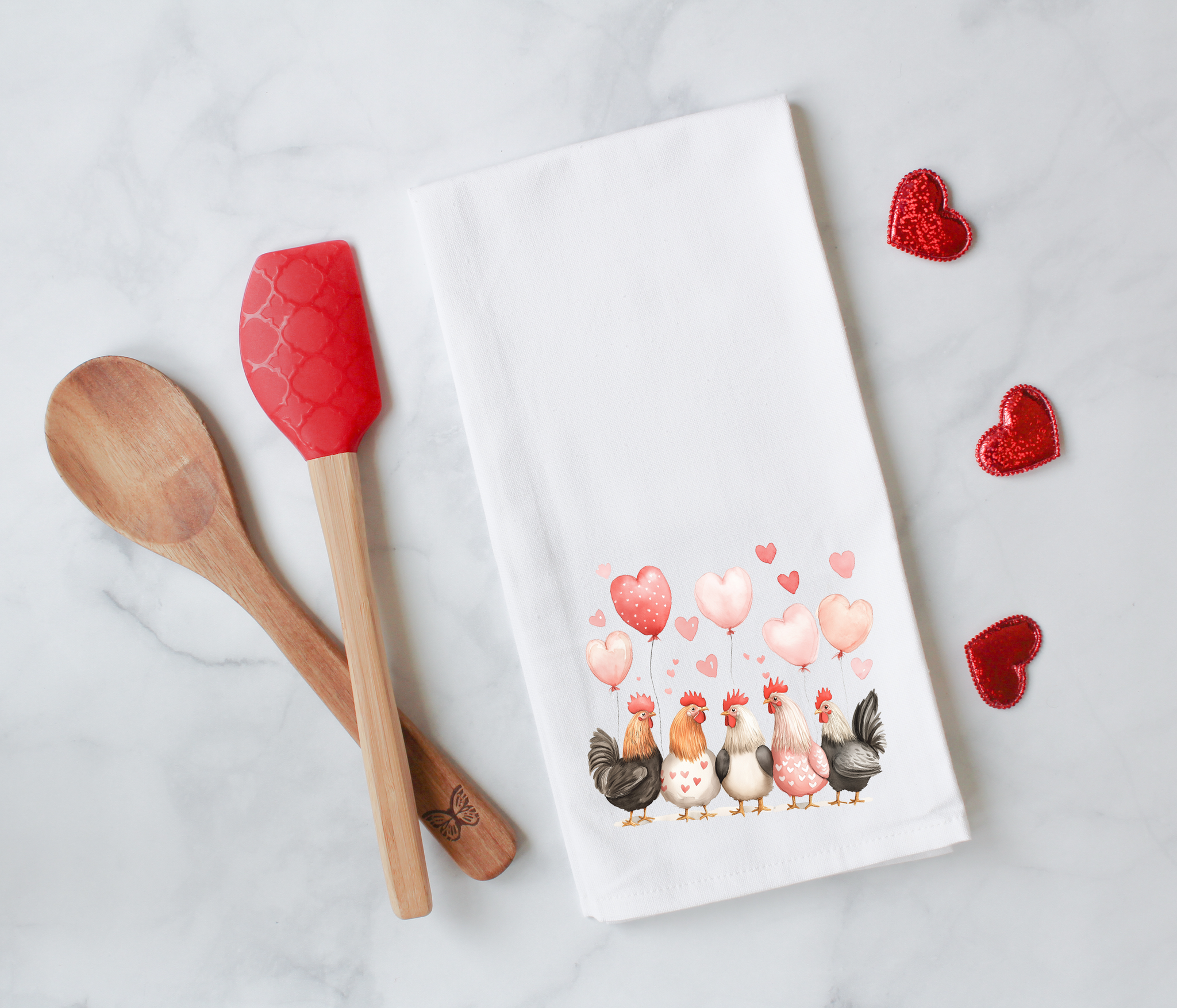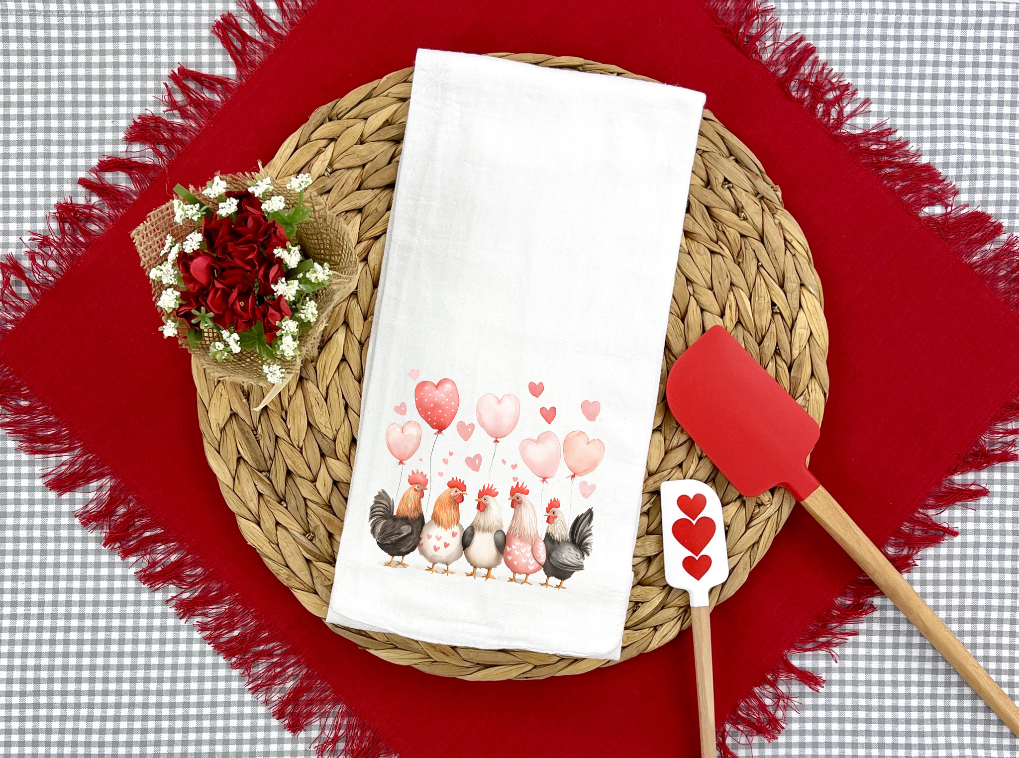 Add a little love (and a lot of charm) to your kitchen with this adorable Valentine-themed chicken flour sack towel. Featuring a sweet flock of chickens holding heart balloons, this towel is perfect for farmhouse kitchens, chicken lovers, and anyone who believes Valentine’s Day décor should be both cute and useful.